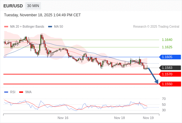 交易策略: 在 1.1605 之下,看跌,目标价位为 1.1570 ,然后为 1.1550 。