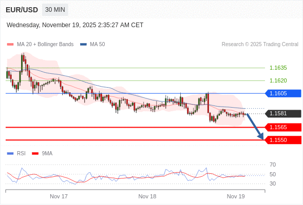 在 1.1605 之下,看跌,目标价位为 1.1565 ,然后为 1.1550 。