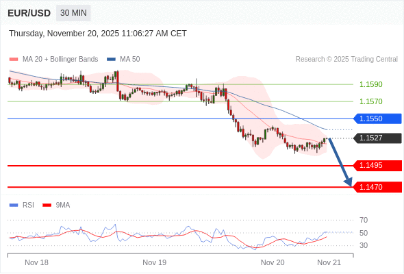 在 1.1550 之下,看跌,目标价位为 1.1495 ,然后为 1.1470 。