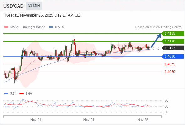 在 1.4090 之上,看涨,目标价位为 1.4120 ,然后为 1.4135 。
