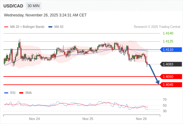 在 1.4110 之下,看跌,目标价位为 1.4060 ,然后为 1.4045 。