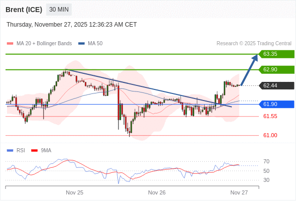 在 61.90 之上,看涨,目标价位为 62.90 ,然后为 63.35 。