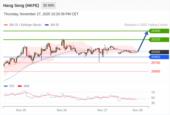 在 25850 之上,看涨,目标价位为 26150 ,然后为 26300 。