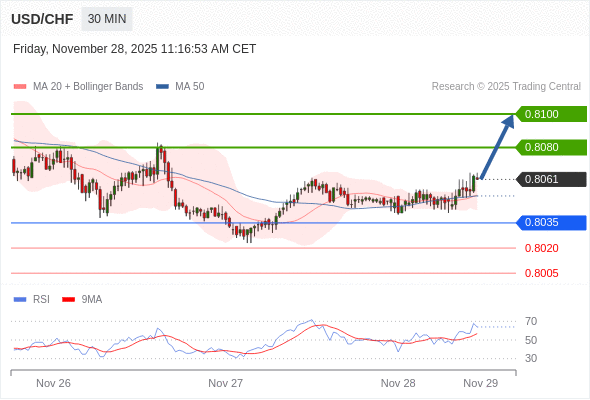 在 0.8035 之上,看涨,目标价位为 0.8080 ,然后为 0.8100 。