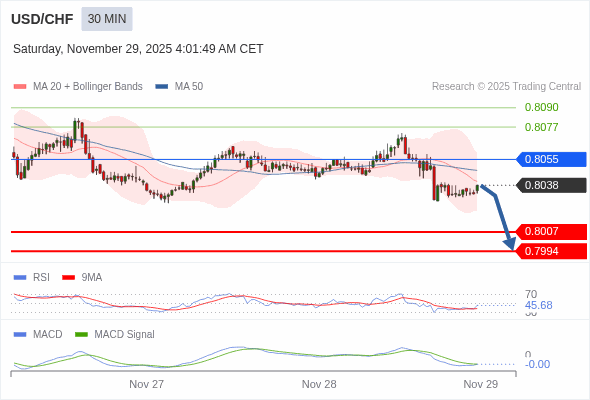 美元/瑞郎 当日内 : 看跌,在 0.8055 之下。