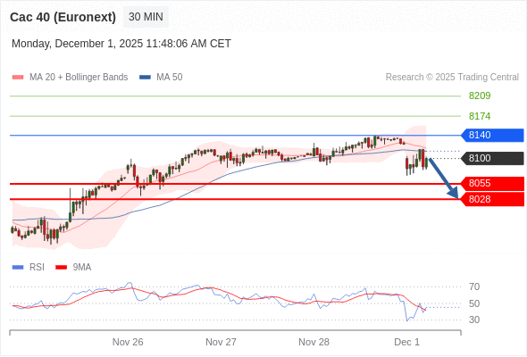 法国CAC指数期货 (Euronext) (Z5) 当日内: 短期关键阻力位在8140。
