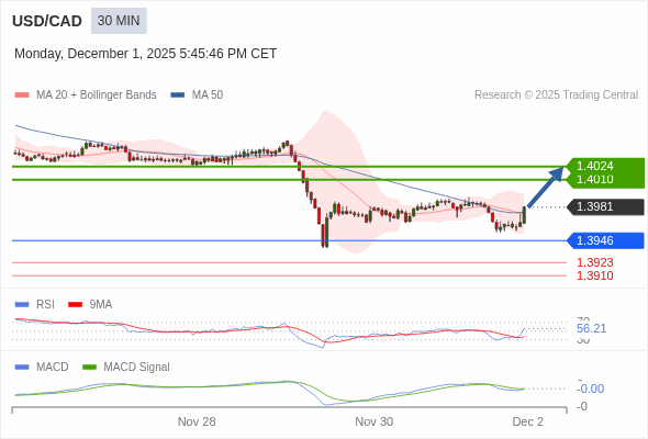 美元/加元 当日内 : 看涨,当 1.3946 未被跌破。
