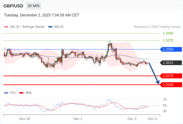 在 1.3250 之下,看跌,目标价位为 1.3175 ,然后为 1.3150 。