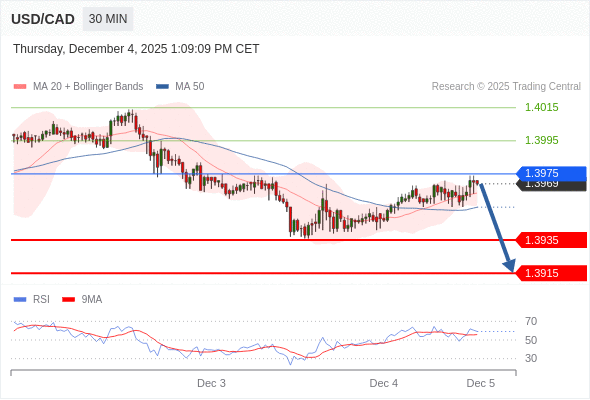 在 1.3975 之下,看跌,目标价位为 1.3935 ,然后为 1.3915 。