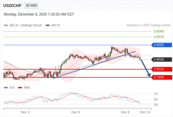 在 0.8055 之下,看跌,目标价位为 0.8010 ,然后为 0.7995 。
