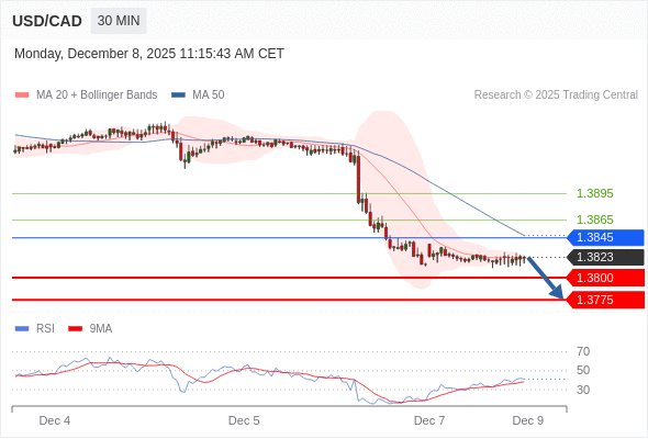在 1.3845 之下,看跌,目标价位为 1.3800 ,然后为 1.3775 。
