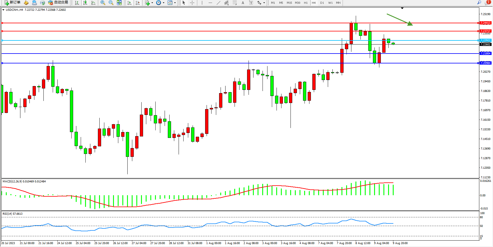 美元人民币USDCNH——4小时K线图显示: