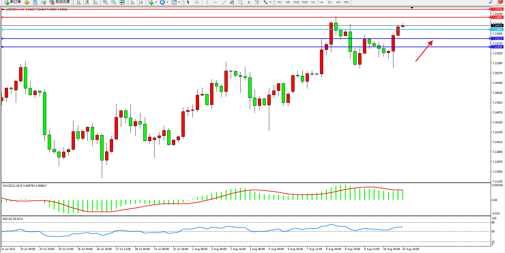 美元人民币USDCNH——4小时K线图显示: