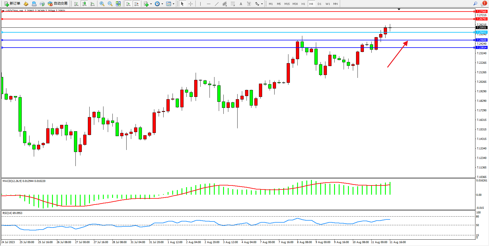 交易策略:7.25412上方看涨,目标7.26793  7.27560
