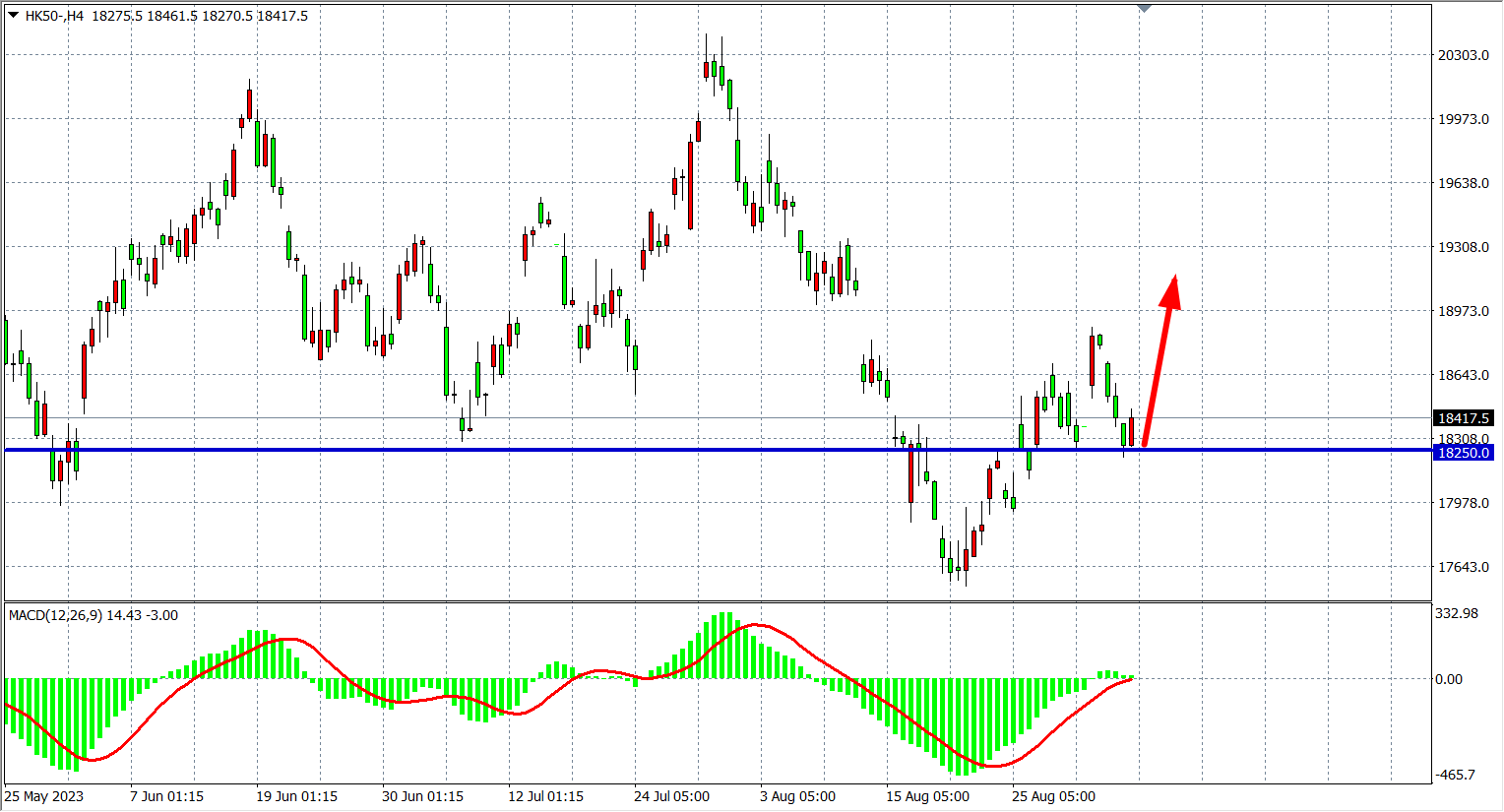 4小时图看,恒指在18250受支撑小幅反弹,MACD量能在零轴上缩量,支撑关注18250-18000附近,阻力关注18700-19000附近。