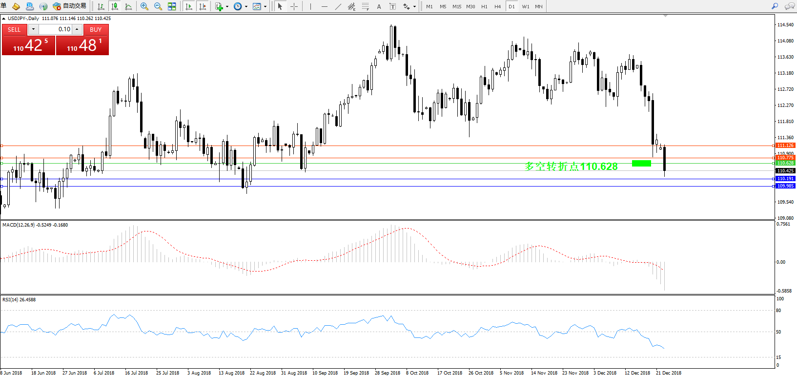 因美国政府关门可能持续到2019年元旦后。美元兑日元日内刷新自9月7日以来新低至110.60,跌幅超0.5%,受益于美元疲软及全球股市普遍走弱,支撑了日元的避险需求。美元兑日元面临的一个主要风险是,日本投资者没有充分对冲投资美国资产所带来的外汇风险敞口,这意味着美元兑日元的损失可能会随着投资者的恐慌和撤离而导致更大的损失;日益增多的未对冲日本和美国敞口增加了日本海外资产风险敞口,只要外汇波动保持温和,这种上升就没有问题,但一旦外汇波动加剧,可能导致资产清算。