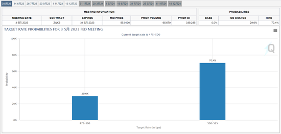 CME美联储观察工具的数据,截至发稿,市场预计美联储将在下次会议上加息25个基点的概率为70.4%,按兵不动的概率为29.6%。