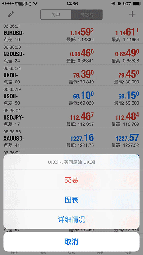 1.在行情界面中点击“简单”和“高级的”,进行切换。