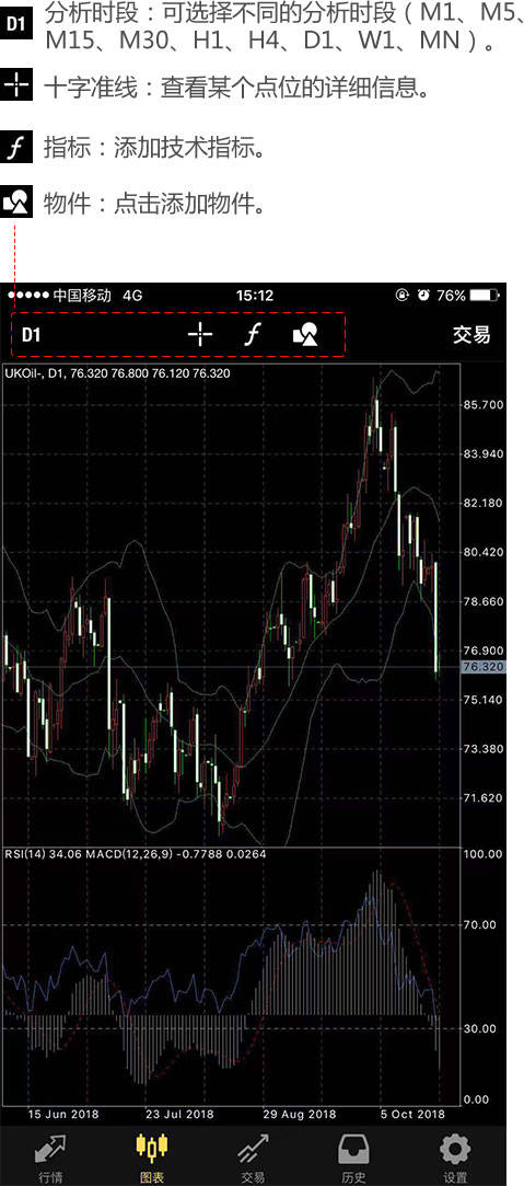 点击菜单栏的“图表”图标,将进入到图表页面。您可放大或缩小图表,也可通过水平滑动查看历史价格。